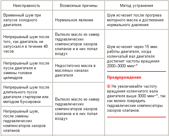 Основные неисправности гидравлических компенсаторов зазоров клапанов, причины и методы устранения приведены в таблице.